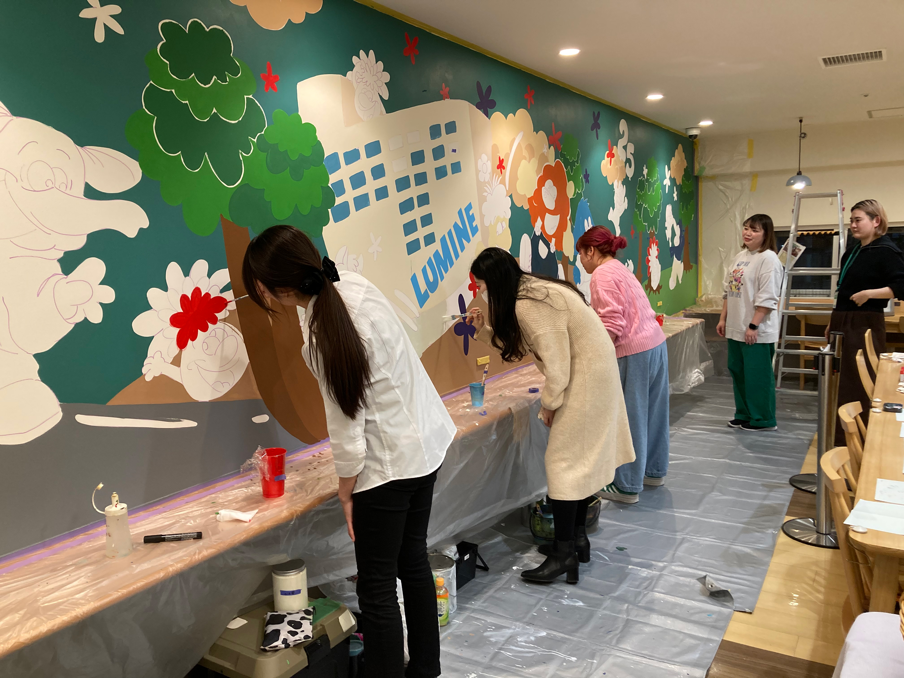事前にスタッフからデザインやイメージについてアイディアを集め、そこで挙げられた町田のイメージを反映していただきスタッフ休憩室の大きな壁に町田店25周年の文字や町田の市花であるサルビアを散りばめた特別なアートとなりました。