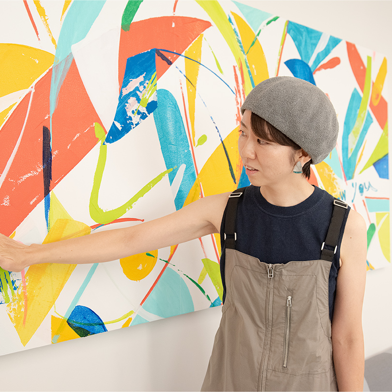 「私はずっと、旅先にステイしながら日常に入り込み、土地や人々のエネルギーを感じながら作品を制作してきました。完成した作品がそのまま現地に残り、新たな風景を生み出していくことを願いながら。今回のルミネとのプロジェクトも、私にとってはその延長線上にあるもの。現場での3日間の制作中、通りすがりの社員やゲストの方が話しかけてくれて、まるで旅先で現地の人と交流するような楽しさがありました。制作しながら感じた本社の明るくてオープンなムードが、作品のカラフルで躍動感のあるタッチに反映されているかと思います」
