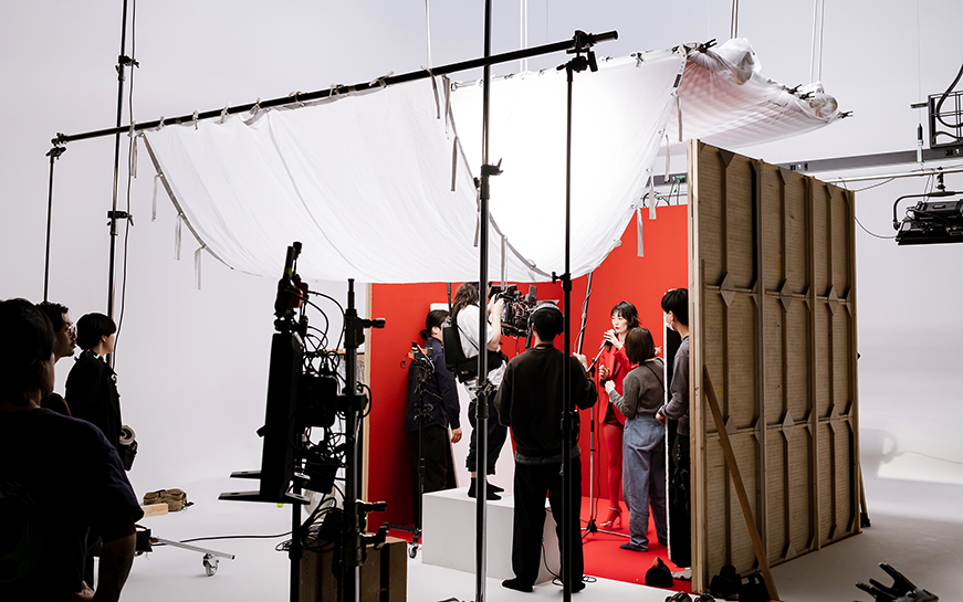「単純に“かっこいいミュージックビデオ”という印象にならないよう、ニュウマンのビジュアルとしてのスタイリッシュさや感度と、音楽のステージやパンクスというテーマのバランスをかなり吟味しながらつくりました。撮影自体も、これまでのシーズンビジュアルでいちばん時間がかかったかもしれません。たとえば赤の色味をどれくらいにするか、ライティングのバランスをどうするか、マイクの持ち方をどうするかなど、細かいところまでスタッフで意見を出し合い慎重に調整しました」