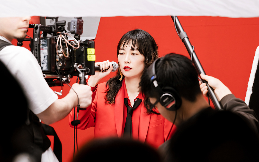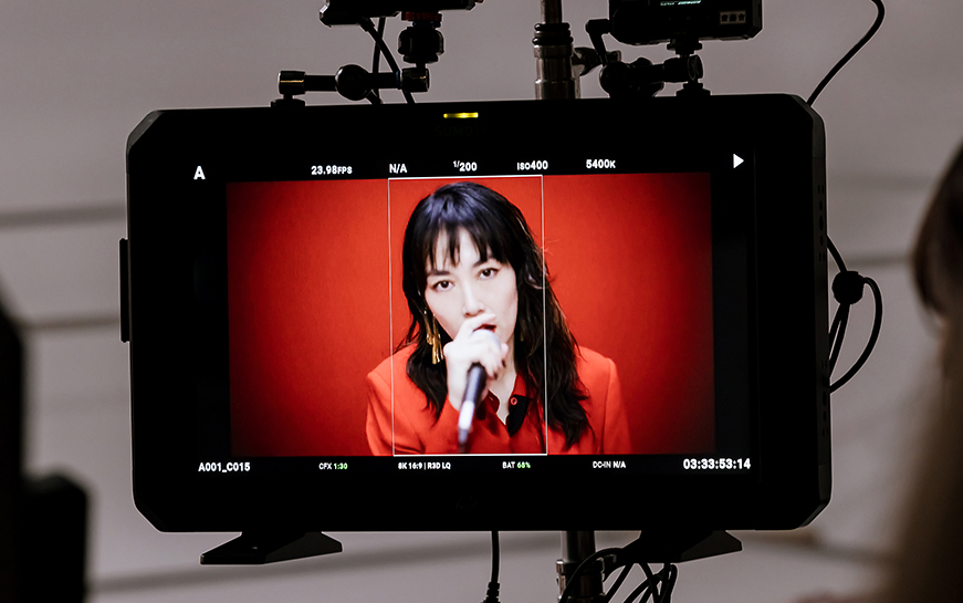 深く激しいエネルギーを感じる真っ赤な空間で、全身を使ってマイクに感情をぶつける菊地凛子さん。ムービーでは凛子さんの叫ぶ声は聞こえませんが、聞こえないはずの声が視覚を通じてダイレクトに飛び込んでくるような、そんな感覚を覚えます。