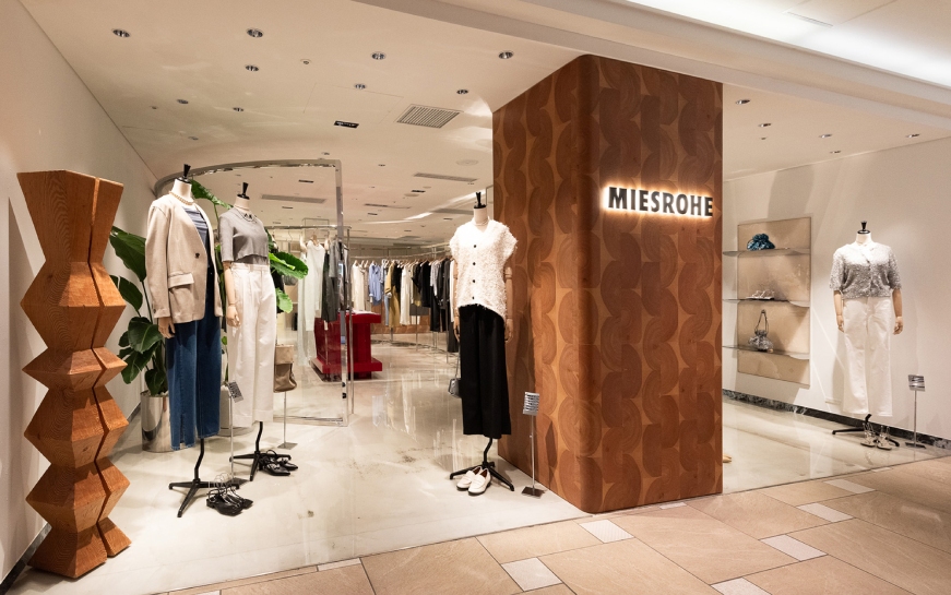 ルミネ新宿 ルミネ1の2階にある「ミースロエ」は2024年3月にオープンした関東地区初の実店舗。無機質さと自然の温もりが調和した雰囲気の内装で、シンプルな服や小物が引き立つようにデザインされている