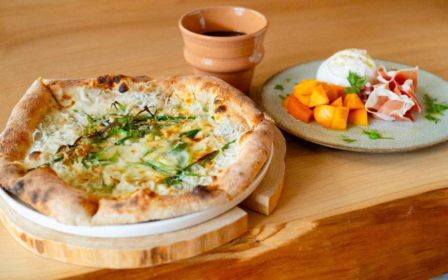 レストラン&カフェ「WOOD FIRE DINING」で人気があるのは薪火で焼く地産地消のピザや旬のフルーツのパフェ。ホットドリンクは地元の赤膚焼の作家によるカップで提供するほか、吉野杉製の取り皿も