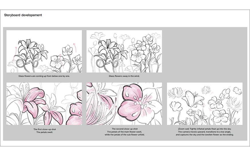 「従来の花をモチーフにした映像とは一線を画したいと考えました。目指したのは、実際の花からインスピレーションを受けながらも、単なる再現ではなく、ガラスの花を通して夢のような、超現実的な雰囲気を表現すること。そのために、さまざまな花の形を研究して照明やテクスチャの調整を細かく行いました。
