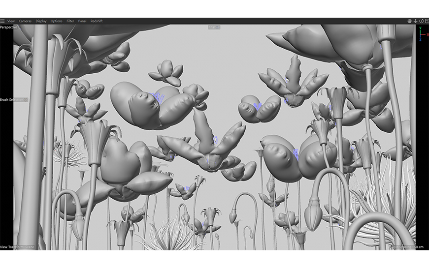 「全体の構図やレイアウト、それらをより素敵に見せるためのカメラアングルのバランスを提案してくださいました。というのも、CGとはいえ実空間でカメラを回すのと一緒で、少しアングルを変えただけでも花の印象が変わってしまうんです。それから、色味と素材感、膨らみの質感。リアルにはない現象なので綿密にシミュレーションをしつつ、プログラムを組んでくれました」